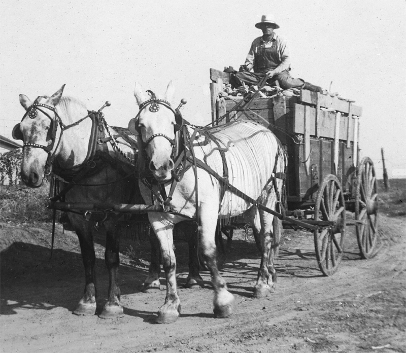 Julius Ohrt picking corn with his Dultmeier wagon made in Manning.