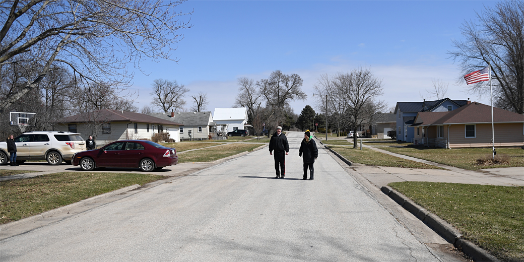 A married couple out for a walk in the sun...also stopping to chat with a couple of people in the distance.