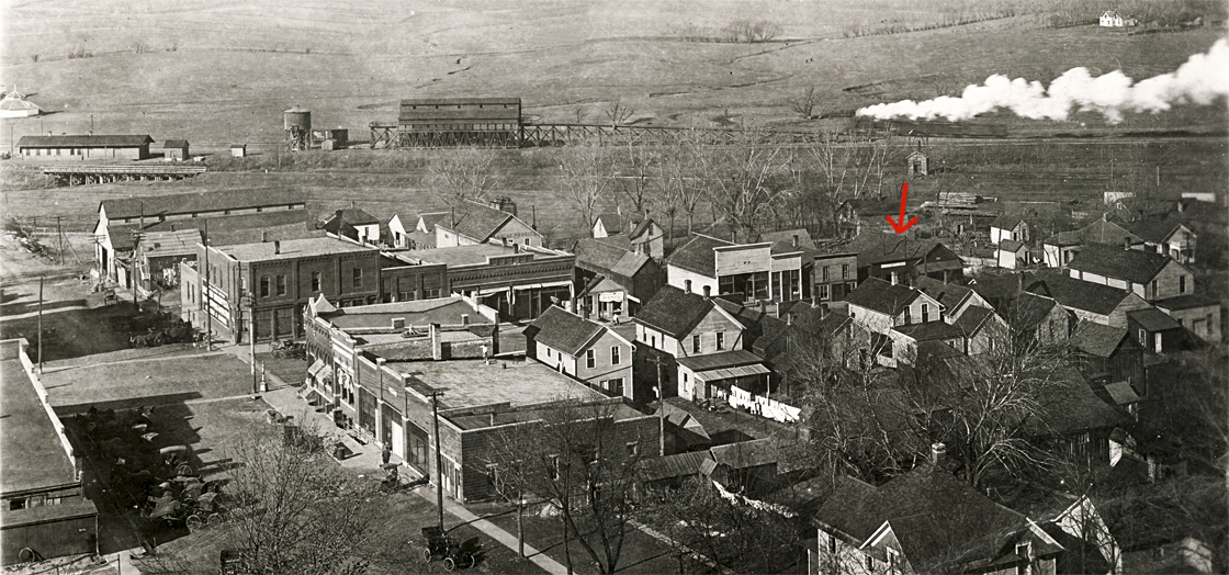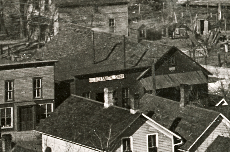 red arrow points to August Reinke's blacksmith shop
