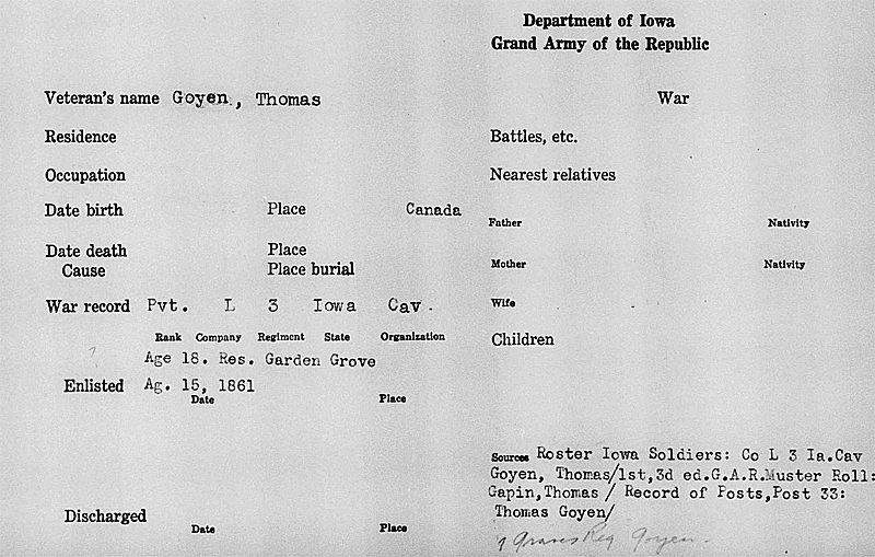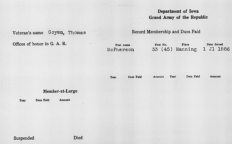 She informed me her great-great-grandfather Thomas Goyen, served in the Civil War and moved to Manning.