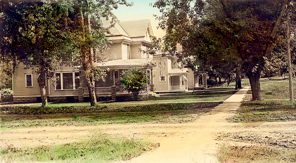 Here is a colorized image of the Hall home, taken sometime before 1923 which is when the residential streets were paved.