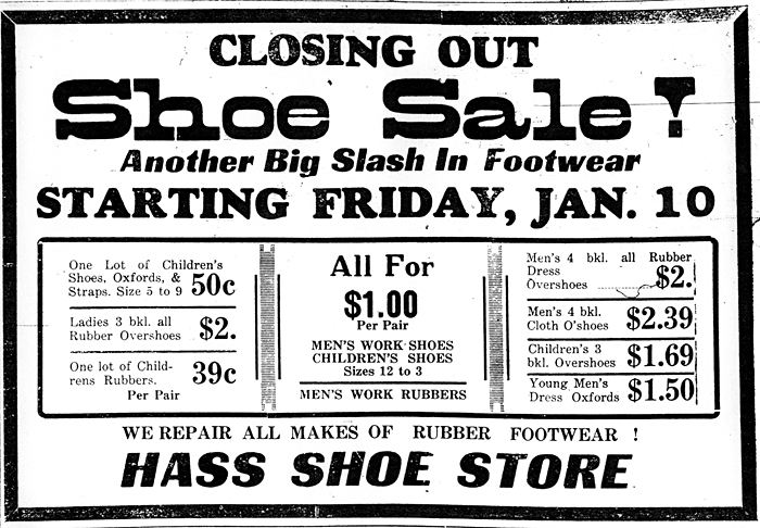 In October, 1964, Hass sold the shoe business to the Manning Bootery. He continued the repair business until 1973.