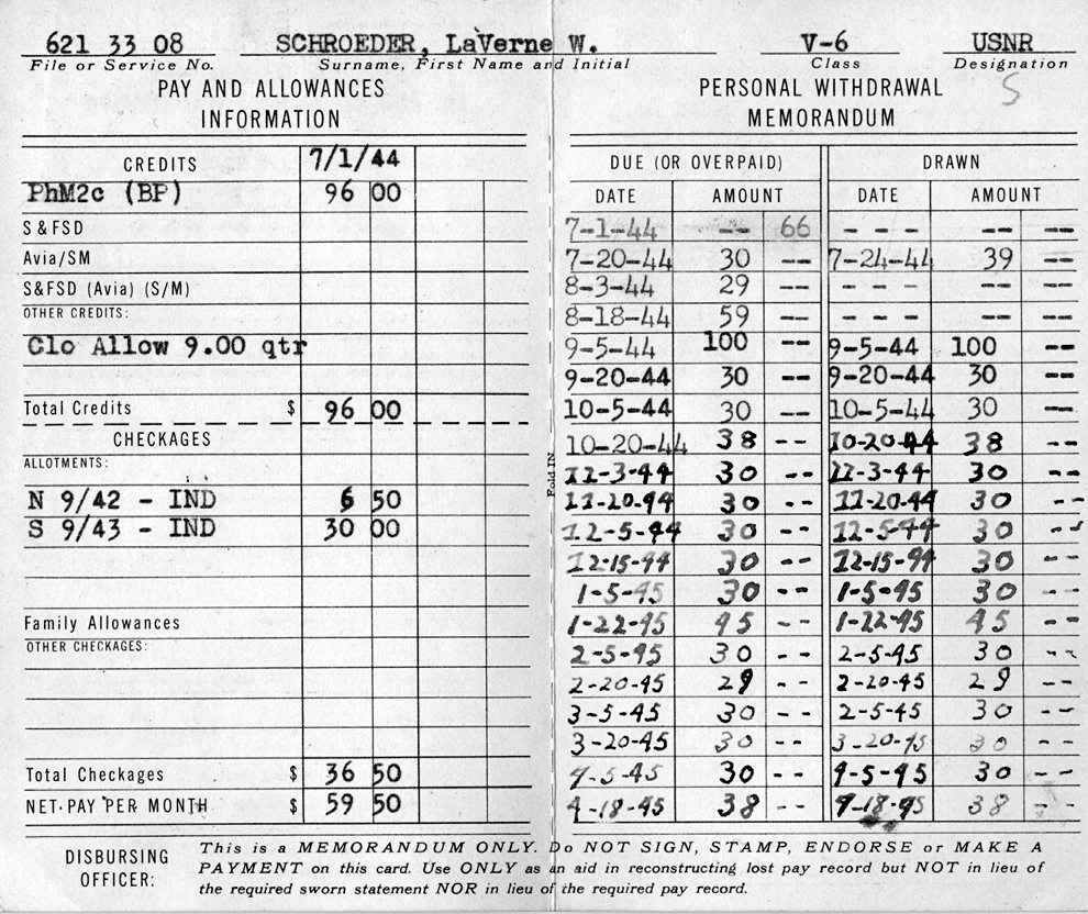 In July of 1945, he was transferred to an advanced medical school at the U.S. Naval Hospital at Portsmouth, Virginia and was stationed there when World War II finally ended. He was transferred to the U.S. Naval Hospital at Corvallis, Oregon in October, 1945, and then to Astoria, Oregon, where he was processed for discharge. He received his honorable discharge from Fort Snelling, Minnesota March 11, 1946, having served three years and five months.