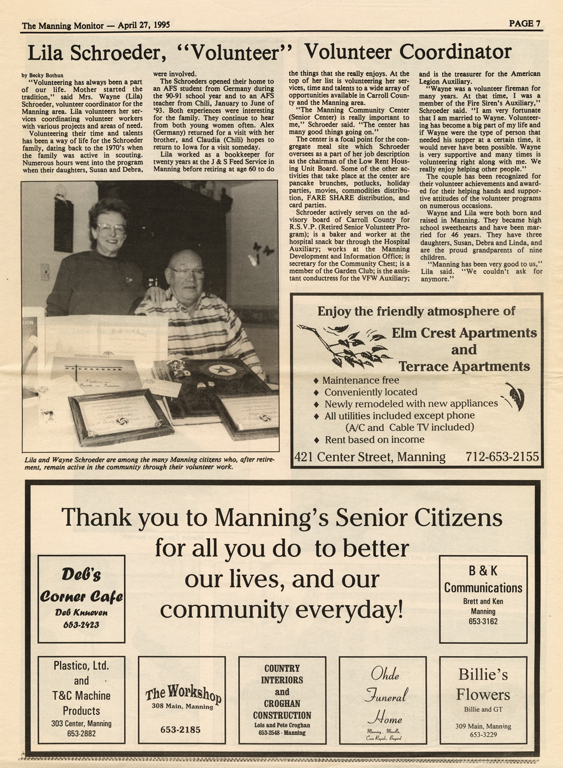 One of the reasons why Lila wanted me to visit with her was so she could give me a 1995 Monitor article featuring "Manning's Special Seniors."