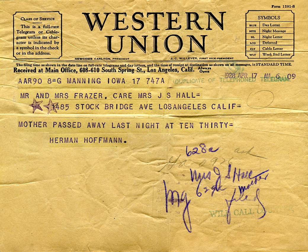 Western Union to Regilda (Hoffmann) Fraser that her mother Magdalena (Claussen) Hoffmann died