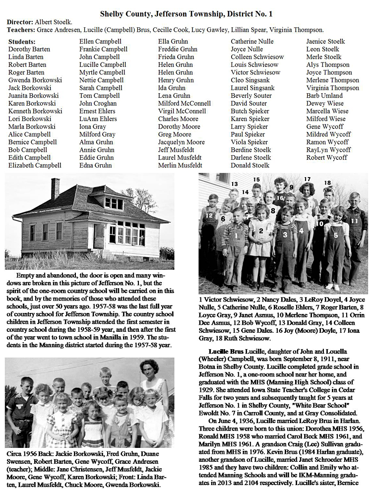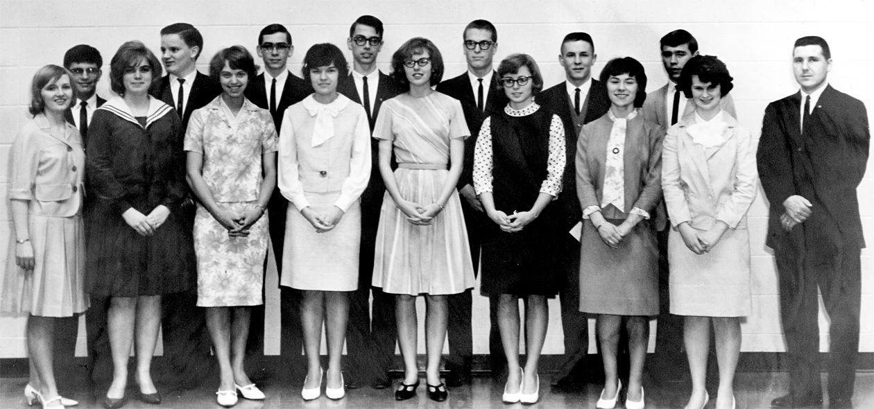 1965 MHS graduates: Connie Anthony, Irma Borkowski, Lyle Borkowski, Nathan Dappen, Ray Dentlinger, John Doyel, Paul Edmunds, Gene Ehlers, Rodney Ehlers, Jane Espenhover, Phyllis Jean Graner, Craig Grau, Curtis Grimm, Joyce Handlos, Jerry Hargens, Hilbert Hoffman, Michael Hoffman, Leroy Irlbeck, Joleen Irlmeier, Albert Jansen, Charlotte Joens, Kathy Johnson, Linda Kasperbauer, Lonnie Kasperbauer, Karen Klocke, Bette Kruse, Linda Kruse, Kay Kuhn, Angela Kusel (valedictorian), Pamela Kusel, Robert Miller, Julie Monson, Harlan Moore, Jacquelyn Moore, John Moeller, Janis Mundt, Jeff Musfeldt, Rose Nepple, Lois Oakley, William Ohde, JoAnn Peters, Dan Pratt, John Ramsey, Rebecca Ramsey, Carol Ranniger, Janet Ranniger, Joan Ranniger (salutatorian), Karen Reinke, Larry Rohe, Daru Ross, Steven Rutz, William Saunders, Tom Schroeder, Philip Sextro, Gay Singsank, Karen Spieker, Jon Stein, Jim Steinke, Linda Struve, Gretchen Tank, Barbara Vollstedt, Donna Wegner, Jerry Walsh, Robert Wetzel
