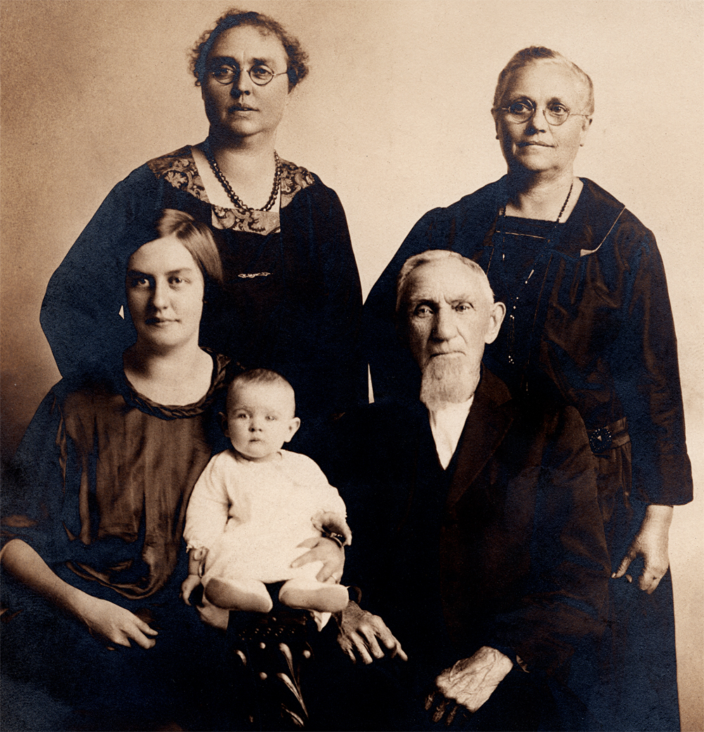 Seated: Nellie (Mohr) Ohrt holding Marian Ohrt, John H. Kuhl