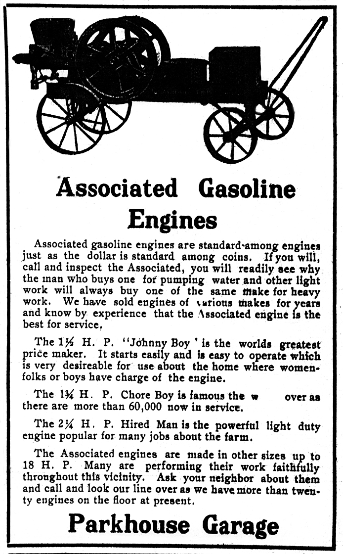 A son, Lloyd, died in infancy. Mr. Parkhouse was in the harness and garage business at Manning for nearly thirty-five years. The family moved from Manning to Redfield, Iowa, living there three years. Two years ago, they moved to Traer, after the death of Will Parkhouse, a brother. Mr. Parkhouse assisted here at times in the Claus Wulf Harness Shop.