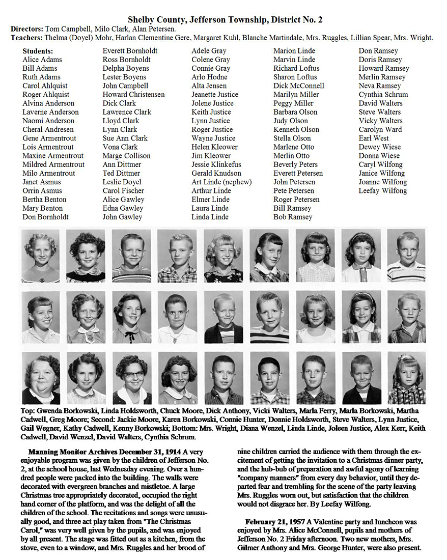 MHS 1953: Vera Ahrenholtz, Marlene Anthony, Glenn Branning, Phyllis Branning, Claus Bunz, Margene Drees, Allan Eich, Mary Lou Foley, Daryl Genzen, Loyce Gray, David Grundmeier, Dorothy Hammer, Marlene Hargens, Marlene Jahn, Wilbur Jahn, William Jensen, Ardella Joens, Donna Joens, Barbara Knaack, Dareld Kracht, Gene Kuhl, Gene Martens, Roland Meeves, David Muhlbauer, Robert Neubaum, Pete Petersen, Lewis Puck, Merlin Ramsey, Patricia Ramsey, Richard Rix, Corrine Sander, Cleone Schroeder, Colleen Schwiesow, Maxine Sextro, Ruth Sextro, Shirley Sextro, Glenn Singsank, Melvin Sinow, Donna Spies, Norbert Stoberl, Betty Stuhr, Merlene Thompson, Allen Vennink, Shirley Vinke, Roger Vollstedt, Shirley Watson, Myra Weinbrandt, James Wingrove, Phyllis Zerwas