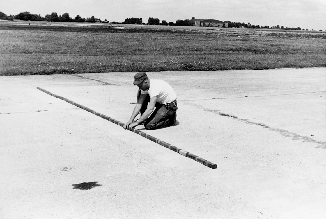 In the late spring of 1955, Pete and most of his company were assigned to a German World War II airbase near the village of Giebelstadt, not far from the German city of Wurzburg. Parts of the base, which was built in the late 1930s and dedicated by Adolf Hitler, had been badly damaged by British air raids during the latter stages of the war, but several barracks and hangers remained largely untouched. The Company's assignment was to clean, repair and lengthen the runway. An occasional encounter with an unexploded British or American bomb or German antiaircraft shells made for interesting duty. Most of it, however, was routine work similar to what they had done elsewhere, but then they got a strange assignment…They were ordered to build a large circular pad of asphalt directly in front of one of surviving hangers with a narrow road connecting it to the runway.