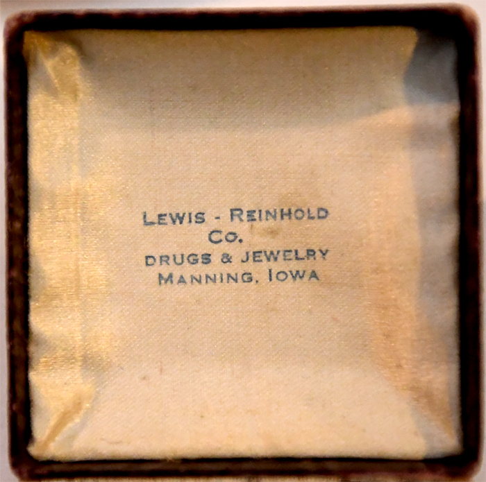 This little box and gold pin were found in the old Hugo & Elsie (Kuhl) Wilhelm home at 1010 Maple Street by Joe Kalkhoff whose parents lived at this location for several years.