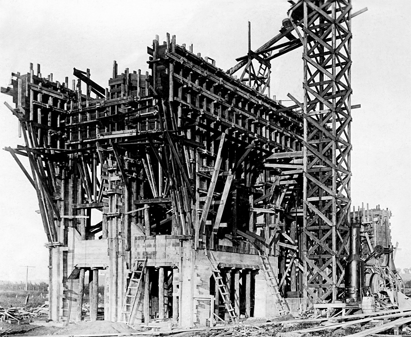 Here you see 14x14 inch vertical support beams to hold up the bridge structure as it was being assembled.