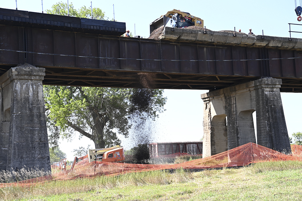 They used a skid loader to push the gravel ballast off of the concrete slabs.