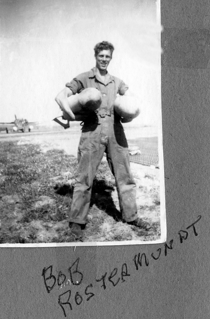 Rostermundt in Thunderbolt Unit This outfit, strafing and dive-bombing enemy fortifications in the path of the American Seventh Army, provides close air support. Although dive-bombing is the primary function of the group, 53 enemy aircraft were destroyed and 23 were damaged since its arrival in the ETO. Besides preparing for the landing in France, a number of red letter days stand out in the history of the group. The dawn-to-dusk invasion cover, the low level, pin point bombing of German gun positions, the elimination of over, 800 enemy troops near Cherbourg, the destruction of six F. W. 190's, and 200 vehicles in two days. In the ten months since the group left the U. S., Sgt. Rostermundt has received the ETO ribbon with two battle stars for the Air Offensive of Europe and Normandy campaign. Bob Rostermundt Writes From France France, 1944. Dear Sir: I want to take this time in thanking you and the American Legion for sending me the Monitor which I have always received despite the difficulties of overseas shipment. I greatly enjoy reading the home town news and especially enjoy the Se Service Men's Column, which enables me to keep in contact with must of the fellows; which otherwise would be impossible. Thanking you again, Bob Rostermundt. Observed First Anniversary With Fighter-Bomber Group A Ninth Air Force FighterBomber Base, France. Sgt. Robert H. Rostermundt, son of Mr. and Mrs. Harry Rostermundt, 115 Sue street, an airplane armorer, recently celebrated his first anniversary overseas with a Ninth Air Force fighter-bomber group, commanded by Colonel Bingham T.; Kleine of Gonzales, Texas. The fighter group flew its first mission from English bases, moved to the continent soon after D -Day and since then has coordinated in dive bombing and strafing attacks ahead of the American First, Third and Seventh Armies.