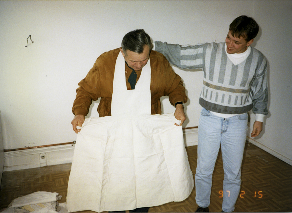 Peter Kusel displaying the apron.