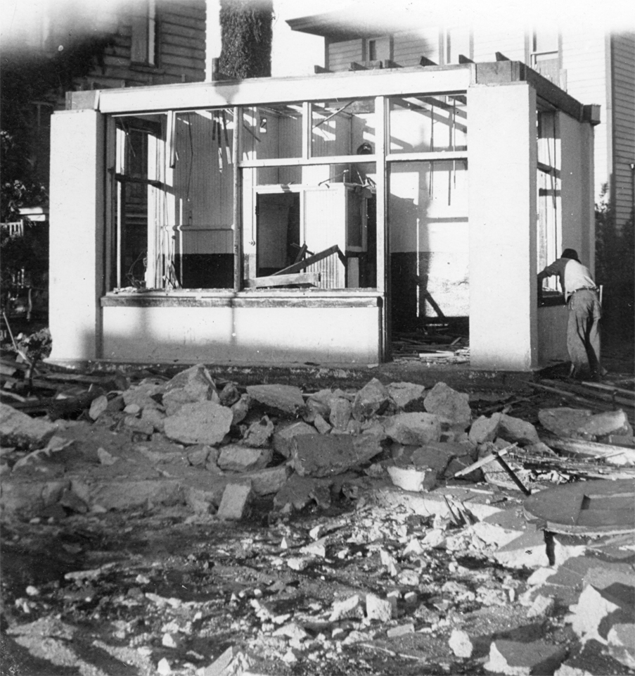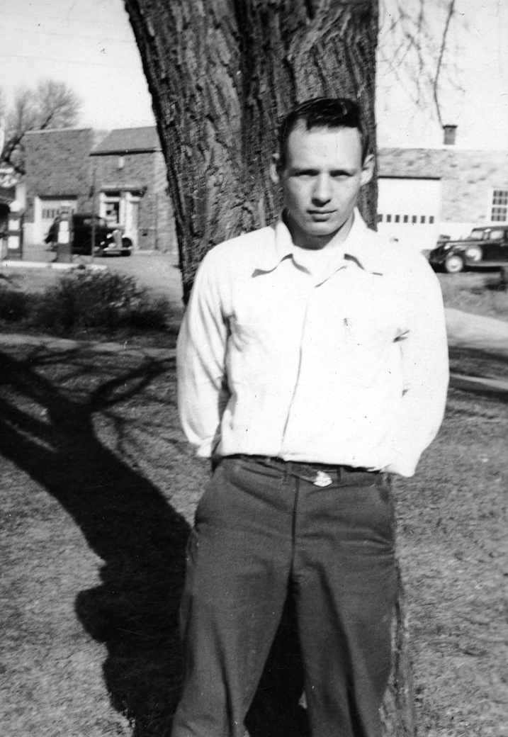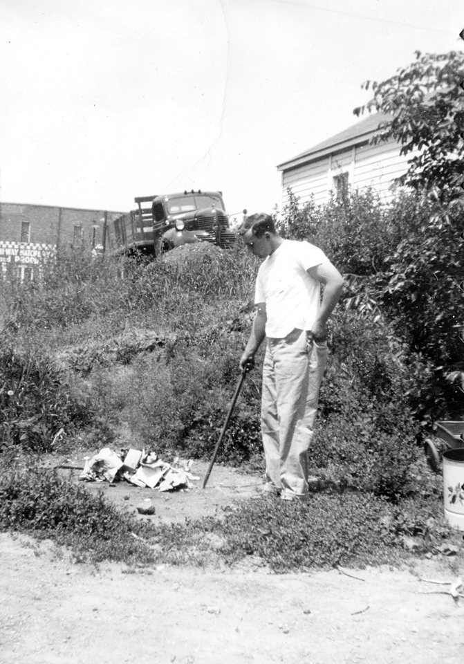 1948 Gerald Schroeder burning trash - the large Petersen garage not yet built.
