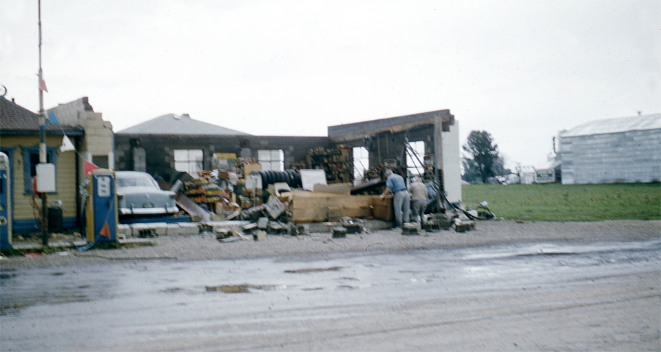 Clark Station on the west edge of Manning along 141 - cement block building blown apart.