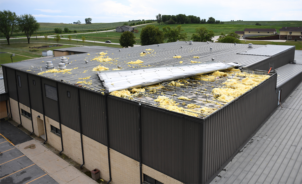 Northwest corner roof over the balcony & weight room of the high school in Manning.