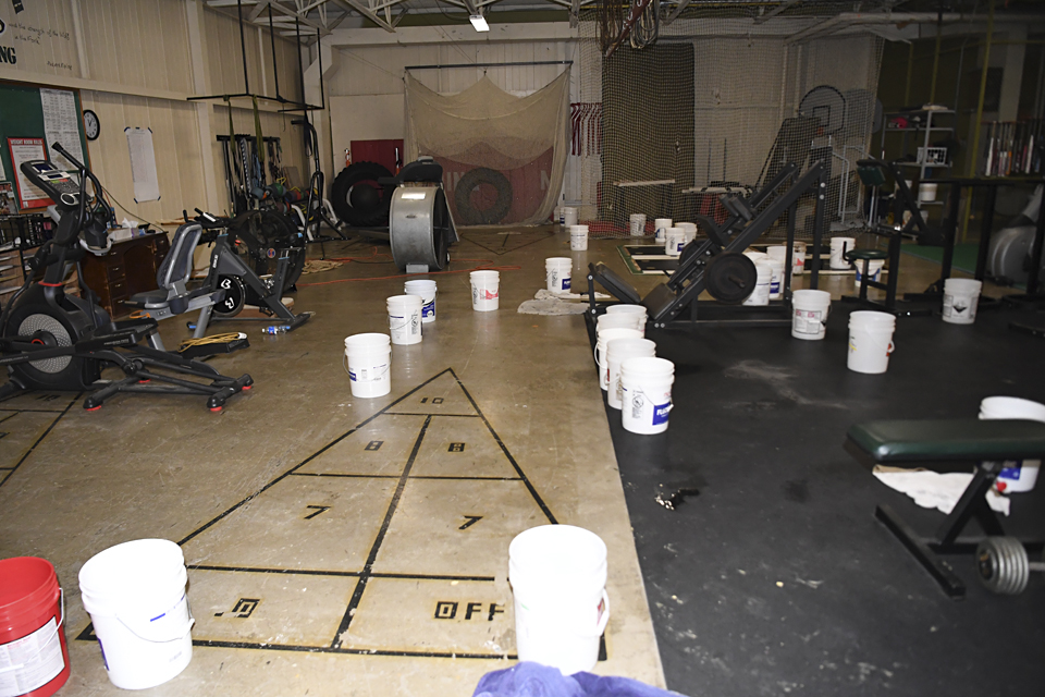 floor and NOT over the wooden gymnasium floor or over other rooms with items and carpet that would get soaked and damaged.
