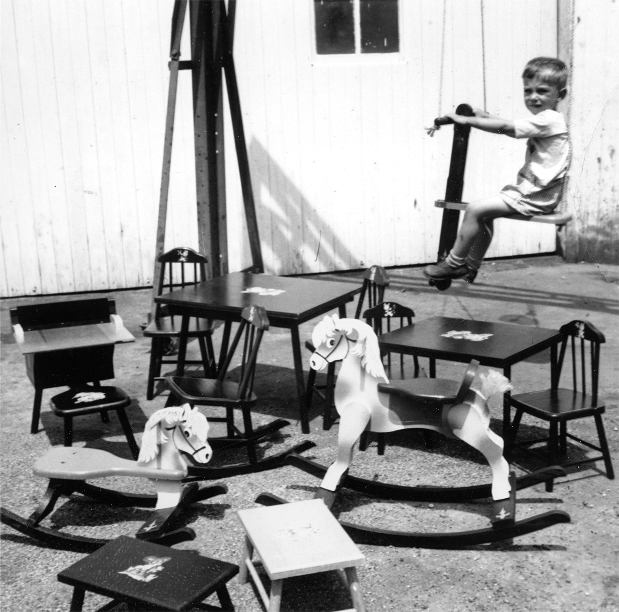 A toy factory was started in December 1950, by Joe Poley, Dr. Joe Loucks, Fay Donaghu and Ted Rix. It was located in the old Farmers Union building, now owned by Manning Ag, on the east side of the street just north of the Dappen property on the corner of First and Main. The idea was to get into the manufacture of small wooden toys. The first project was a child's chair made along the Queen Anne lines for 5 or 6 year olds, painted a bright red. It retailed for $1.69. Labor and production problems were primarily the cause for its abandonment after some months of operation.