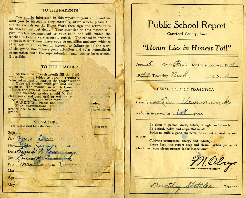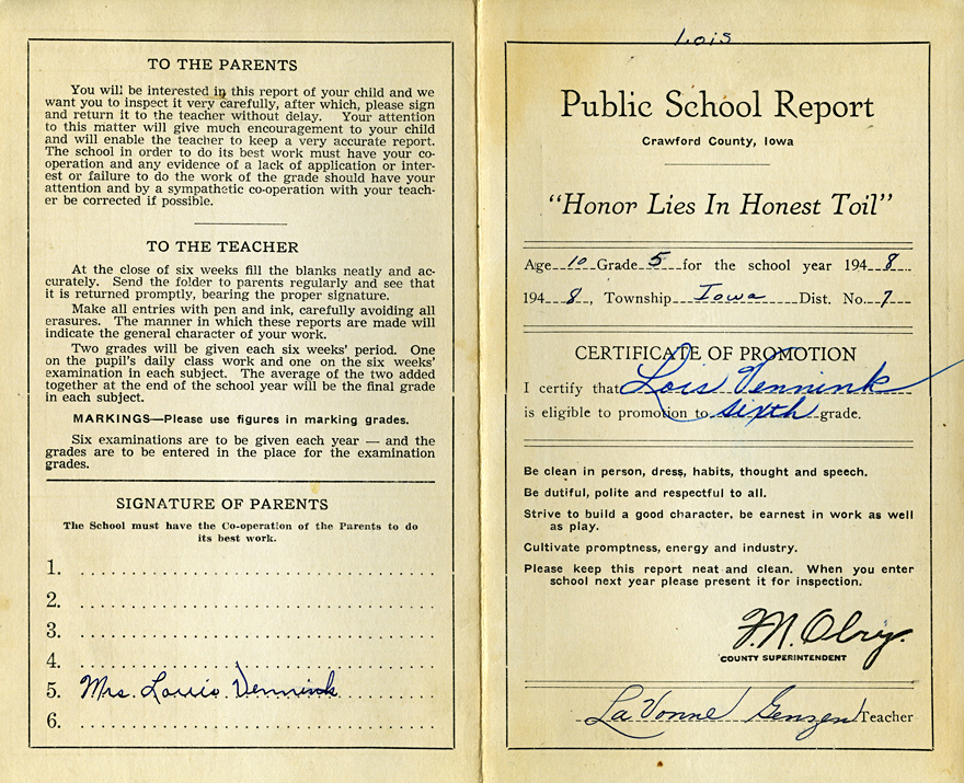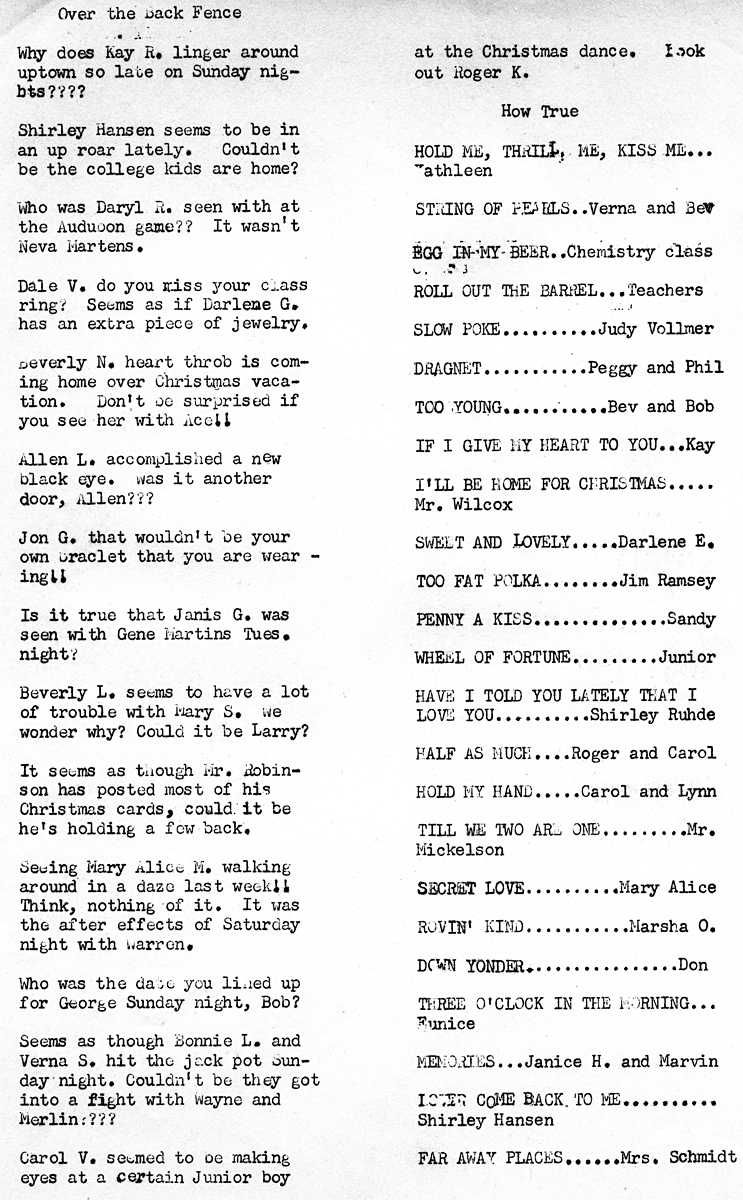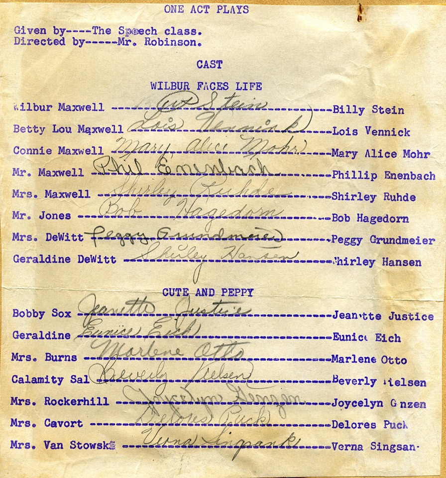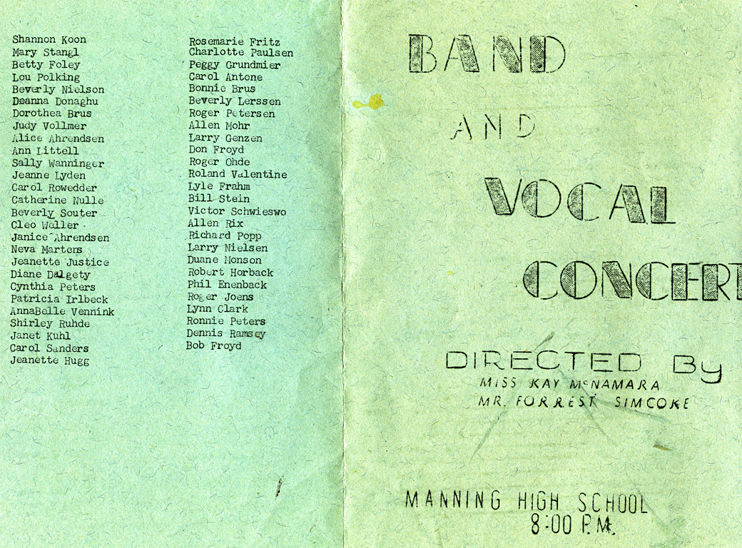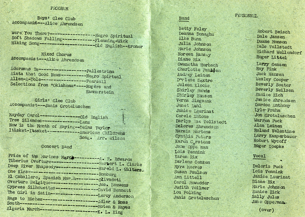 1955 former students: Clark Addison, Lois Armentrout, Jerold Barten, Susan Brandt, Sally Christensen, Delores Davis, Carol Fuller, Letty Fuss, LuEtta Gehlsen, Margaret Gensler, Duane Hansen, Patty Hansen, LaRue Hodne, Mary Kennedy, Marsha Kuhl, Jackie Lee, Clifford Letty, Ann Littell, Janet Martens, Ronald Masters, Kathryn Nollen, David Olbertz, Mary Ann Peters, Norman Pieper, Mark Ramsey, Gene Rostermundt, Gregory Schurer, Sondra Spicer, Janice Stein, Patricia Volquartsen, James Williams