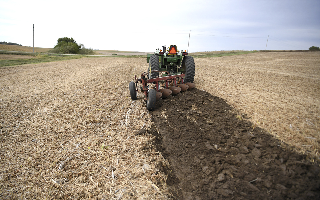 with horses and put in corn through a process called check row planting, gave up the plow as a major tillage tool in the early 1960s, and