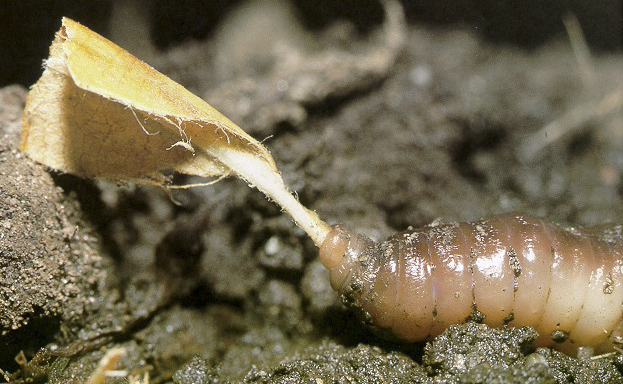 Here you see a night crawler grabbing plant residue on the surface to build his midden, which basically is his compost pile.