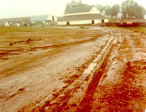 In early April 1974, we disked our hill and seeded oats. We were planning on terracing the hill that summer. We disked the field and seeded the oats one-day and the next day we got a rainstorm. 3 inches of rain in 15 minutes! The lane on the right was buried and the ditch to the left of the lane was completely filled in. |