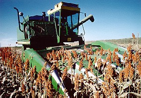 The drought hit late spring and we got very dry. I don't have yield figures but the crop was a little more than half we usually get. In 1976 the drought continued. We planted around 100 acres of grain Sorghum that year. It was the first time we grew sorghum. We had been using the 444 row crop head on soybeans for several years and it worked great for sorghum. The fall of 1976 and 1977 we used the row crop head to harvest the corn. |