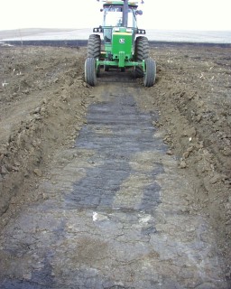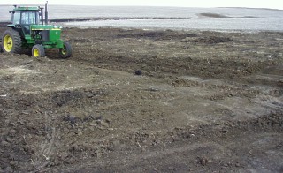 Less than 8 years ago we cleaned out this waterway. As you can see it has silted in almost 3 feet deep from tilled farm ground above. I'm just now getting down to the black soil with the dirt scraper. The clay colored soil is topsoil washed in from a 15 acre watershed above this point. |