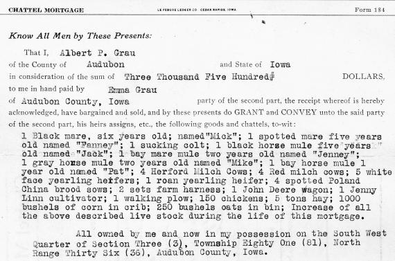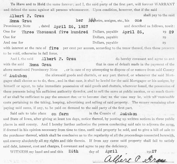 This mortgage was found in a book by a lady who lives in Missouri. She purchased the book at an auction in the 1970s and her son contacted Tom Grau in Manning to return it to the Grau family. Tom received this mortgage in November of 2003.