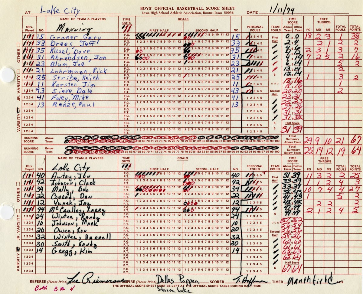 January 11, 1974 Varsity Boys' score sheet. Gary Graner tied Randy Lohmeier's individual scoring record of 38 in 1972.