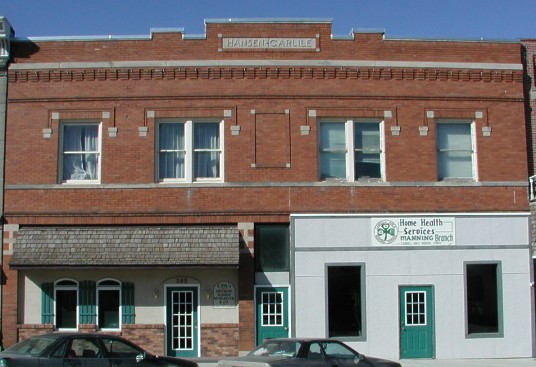 HANSENS GROCERY STORE When we think of old and continuing business we must surely consider the one started in 1881 by George Detlefs Sr. and John Karsten. They started to build in 1881 and on February 15, 1882, they opened the doors to a thriving grocery store business. Ted Hansen purchased Mr. Detlefs' interest and it was called Hansen and Karsten. Ted Hansen was in the business for over 40 years and can certainly be considered one of the pioneer merchants of Manning. Herman Hansen became a partner and it was called Hansen and Hansen. Later another partner was added and it was Hansen & Hansen & Alberts. Pete Hansen was the owner manager for a number of years and his former customers still remember the delightful bird whistles Pete honored us with as he sacked our groceries. Herman Pahde was the owner-manager of the clothing department during much of this time, making this a most convenient one stop store. Pete went to Des Moines to serve as an Iowa State Senator and the store was sold to Amos Rutz in 1956. The name of the store was changed to The A. and G. Store. Amos had been a clerk in the store for many years so knew the business well. However, he went into another business in 1965 and the store was closed. This was the end of a continuous grocery business for over 83 years. The building, at 305 Main, is now occupied by the Manning Gas Company. |
