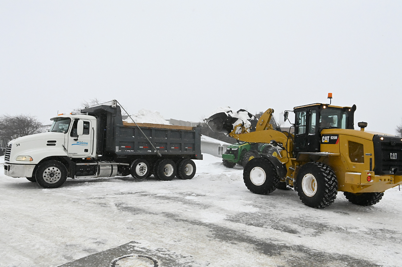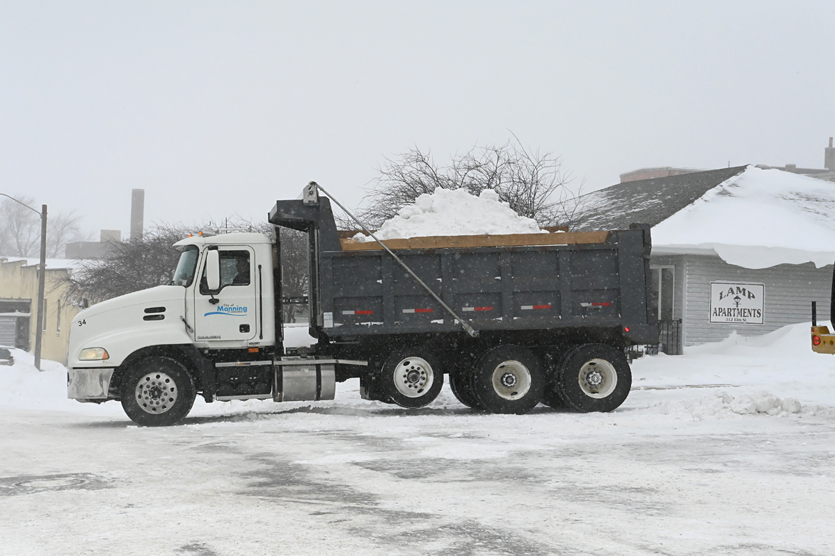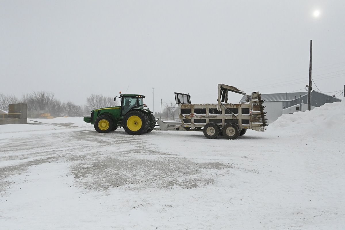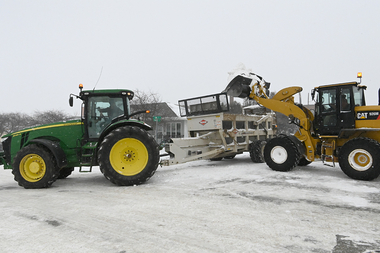 Leave it up to Midwest ingenuity and farmer thinking to use a manure spreader to help haul away the snow piles.