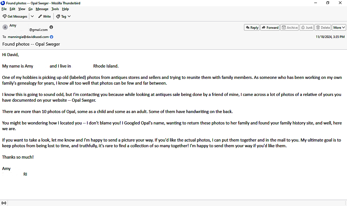 This Sweger feature has a unique situation in that Amy from Rhode Island found my web page and offered to return home a number of Sweger pictures she had come across.