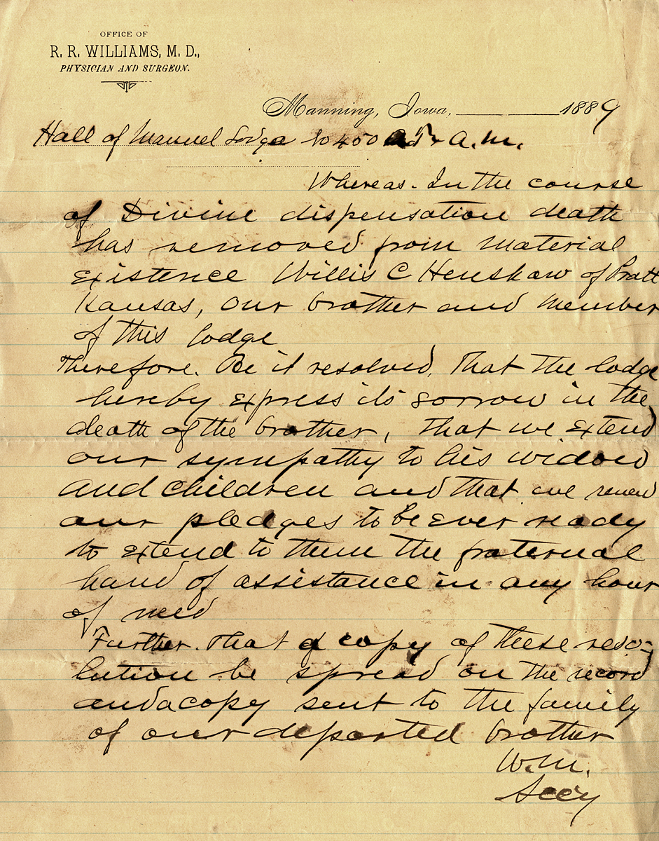 Items I scanned in 2017 from the huge trunk of the Manual Lodge #450 of Manning that Craig Williams (no relation to Robert) has in his posession in Manning.