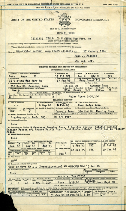 Serial Number 17111829; Enlisted Camp Dodge, February 4, 1943 (date of entry into active service according to discharge papers); Private, Signal Corps, Reserves