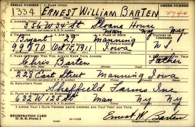 Manning City Cemetery with Rev. Paul Krumm of Zion Lutheran Church officiating. Ernest, son of Chris and Emma Ross Barten was born Oct. 15, 1911 in Crawford County, Iowa.