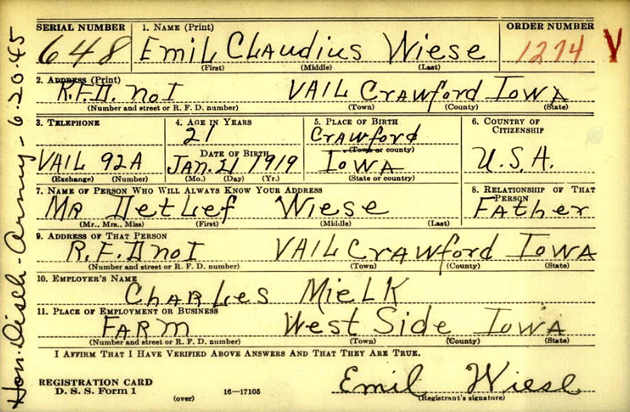 Mr. Wiese was born January 21, 1919, at Hayes Township in Crawford County, son of Detlef and Alma (Kruetzfeldt) Wiese.