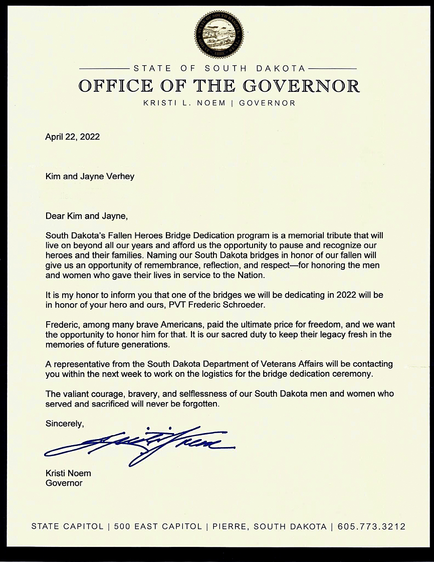 The Frederic Carl Schroeder Legion Post in Egan, South Dakota, is named in his honor.