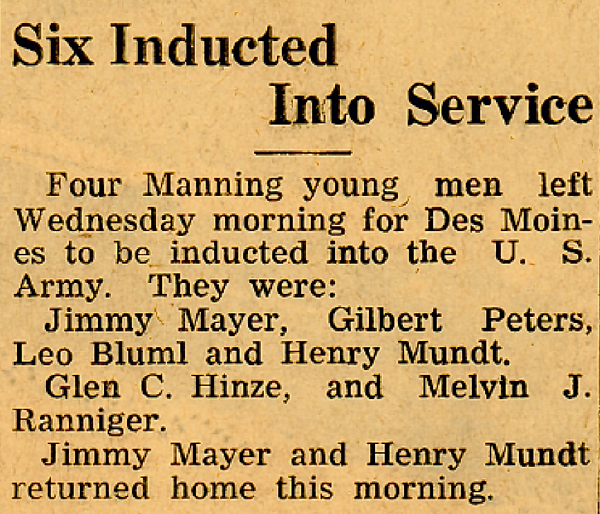 1943 and 1944. On Thursday, July 17, he entered Crawford County Memorial Hospital in Denison, and on the following Sunday he was transferred to Veterans' Hospital, Omaha, Nebraska, where he died on Monday, July 21, 1980, at the age of 77 years, 2 months and 4 days. He was preceded in death by his parents and four sisters: Catherine, Annie, Milda, and Mary who died in infancy. Henry is survived by two brothers, August Mundt and Louis Mundt, both of Manning; nine nieces and nephews and many other relatives and friends. |