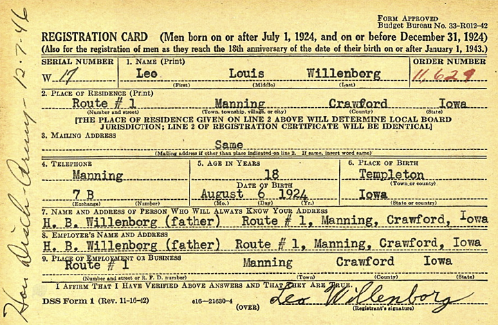 Leo Willenborg, son of Henry and Ida (Uhlenkamp) Willenborg, was born at home on a farm near Templeton, Iowa on August 6, 1924. At 100 years old, he had been through many changes in his lifetime. He walked to a country school about 2 miles from the house, except for 2nd grade, and 8th grade. He attended Sacred Heart Catholic school in Templeton so he could make his First Holy Communion and be confirmed. He graduated from eighth grade at the age of 12. However, due to the hardships of the Great Depression and the need to support his family, he was unable to continue his formal education.