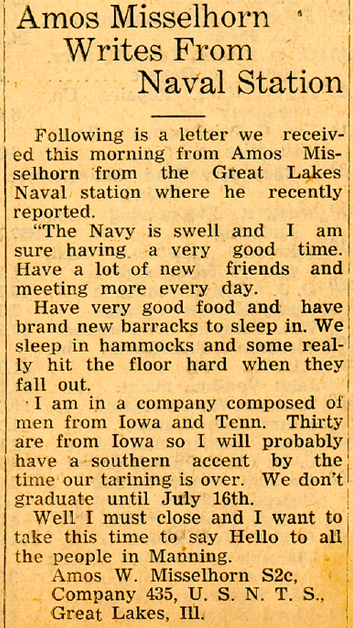Amos William, son of William and Marie Petersen Misselhorn, was born August 3, 1920: at Manning, Iowa. He attended Manning schools and was graduated from Manning High School in 1938. During high school he worked for Valentine's Bakery.