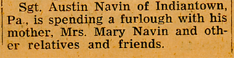 Advanced to Sergeant Austin Navin Visits Home Austin Navin, line Sergeant with the Indian Gap Military reservation Co. A. Headquarters station area battalion, service of Supply, stationed at Harrisburg, Pennsylvania, enjoyed about 48 hours in Manning visiting his mother, Mrs. Mary Navin, before returning to Harrisburg, from which place he will leave for overseas duty shortly.