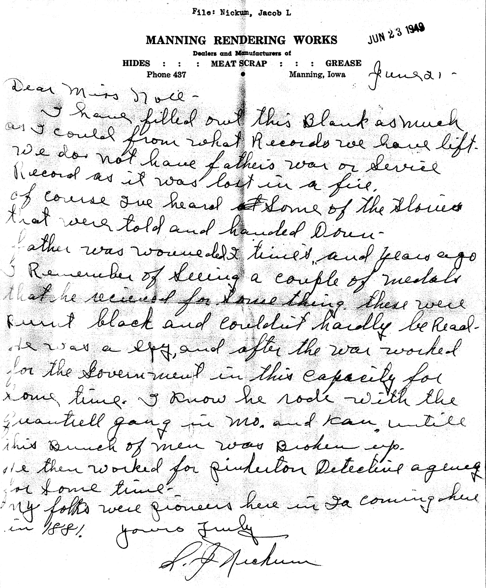 J.L. Nickum was born in the old city of Philadelphia, July 10, 1836, and died April 1, 1900, being in his 64th year at the time of his taking away. He was united in marriage to Lucinda Ellen Hays at Chapel Hill, Missouri, October 26, 1872, and unto this union seven children were born: five sons and two daughters. Mr. Nickum served with the Second Colorado, Company E., in the war of 1861-65. Mr. Nickum came with his family to Manning 19 years ago, having resided here ever since. He was a carpenter by trade, which he has followed continually since convening to this city.