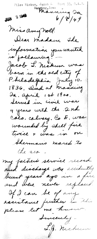 Jacob L. Nickum was born in the old city of Philadelphia, July 10, 1836. Died at Manning, Iowa, April 1st, 1900.