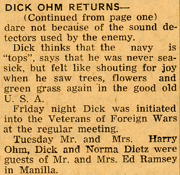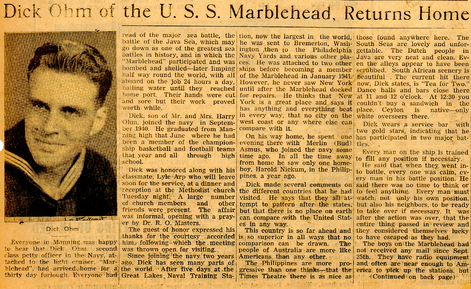 Dick Ohm in New York Richard R. Ohm, storekeeper first class of Manning, has been transferred to duties at Miami, Fla. after serving four years on the cruiser Marblehead, known as the "unsinkable ship." The vessel has been reported sunk by the Japanese several times, but took part in five battles, the last being the invasion of southern France last September. Marblehead Sailors Marry Dan Cupid proved a better marksman than the Japs on the personnel of the "Marblehead" When the blue jackets returned from furlough 60 percent were married. As far as we know, our sailor Dick Ohm is still in the 40 per cent class. This story may prove that the old adage about sailors may not always be true. He may have a sweetheart in every port, but the girl back home, has the inside track. "Boogie Dance of Death" Following in part is a description of the "U. S. S. Marblehead's" part on D-day, written by H. M. Percifield and given to Richard Ohm, a member of the crew: The salvos poured into the Nazi defenses on the south coast of France by the U. S. S. Marblehead and her sister ships in rhythmic, tempo played a boogie woogie death dance for the enemy and well they knew it. Because of the more advanced gadgets of fire control, we of the Marblehead replaced a sister ship in one of the bombardment groups and our spot was considered hot. We would be up against good-sized radar-controlled batteries and the whole area to be destroyed was a nest of radar towers and 88mm's. The firing range was to be 6000 yards. At that range you could not only pick the house but the windows it would go through. The control group was actually three groups working together. We could hit our targets in daylight, darkness, through smoke, and over a hill. They rated us a 50-50 chance of getting in, not a thing was said about getting out!
