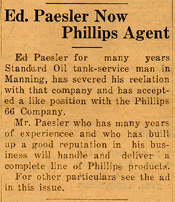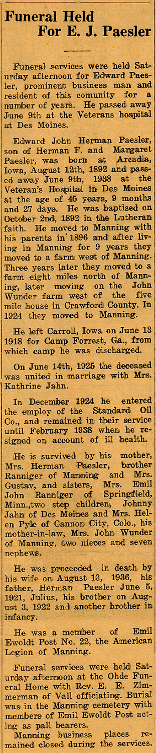 His wife, the former Mrs. Katherine Jahn, preceded him in death in 1936. He is survived by his mother, Mrs. Margaret Paesler, a brother, Gus, a sister, Mrs. Emil Ranniger, all of Manning, and another sister, Mrs. John Ranniger, of Springfield, Minnesota; two step-children, John Jahn, of Des Moines, and Mrs. Helen Pyle, of Canyon City, Colorado; his mother-in-law, Mrs. John Wunder of Manning.