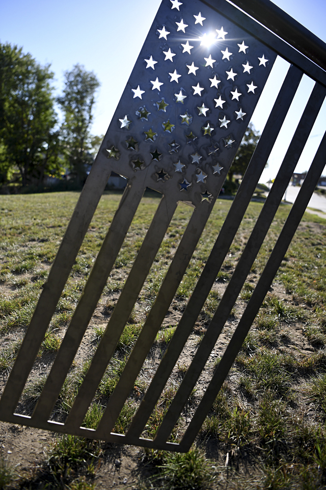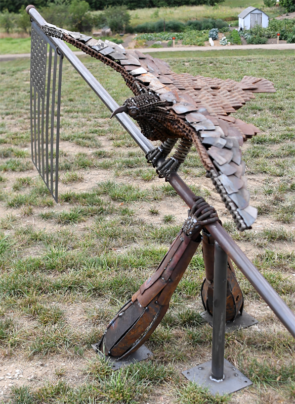 Everything except the pole, mounting plates, and the flag is from miscellaneous parts from the farm and dumpster diving. He thanks Irlbeck Welding for making the flag along with getting the parts and advice that he needed. The feathers on the backside of the eagle are from farm disc blades and cultivator sweeps as well as augers from a combine. The bottom of the Eagle was roller chain from combines and other miscellaneous chain. The beak is a sickle guard. Eyes are nuts and washers. Internally the frame of the eagle was made from hog paneling. The support arms are made of disc and auger tubing. The hands are chunks of steel rods.