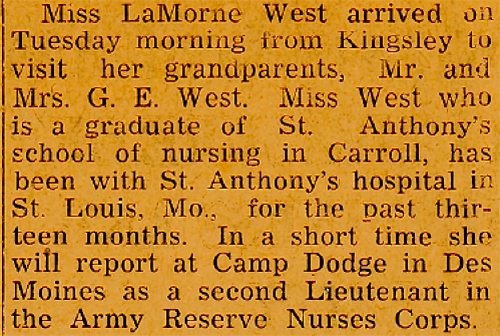 She was born December 19, 1919, in Manning, Iowa, to Lester Bowman "Jack" and Pearl (Franzwa) West.